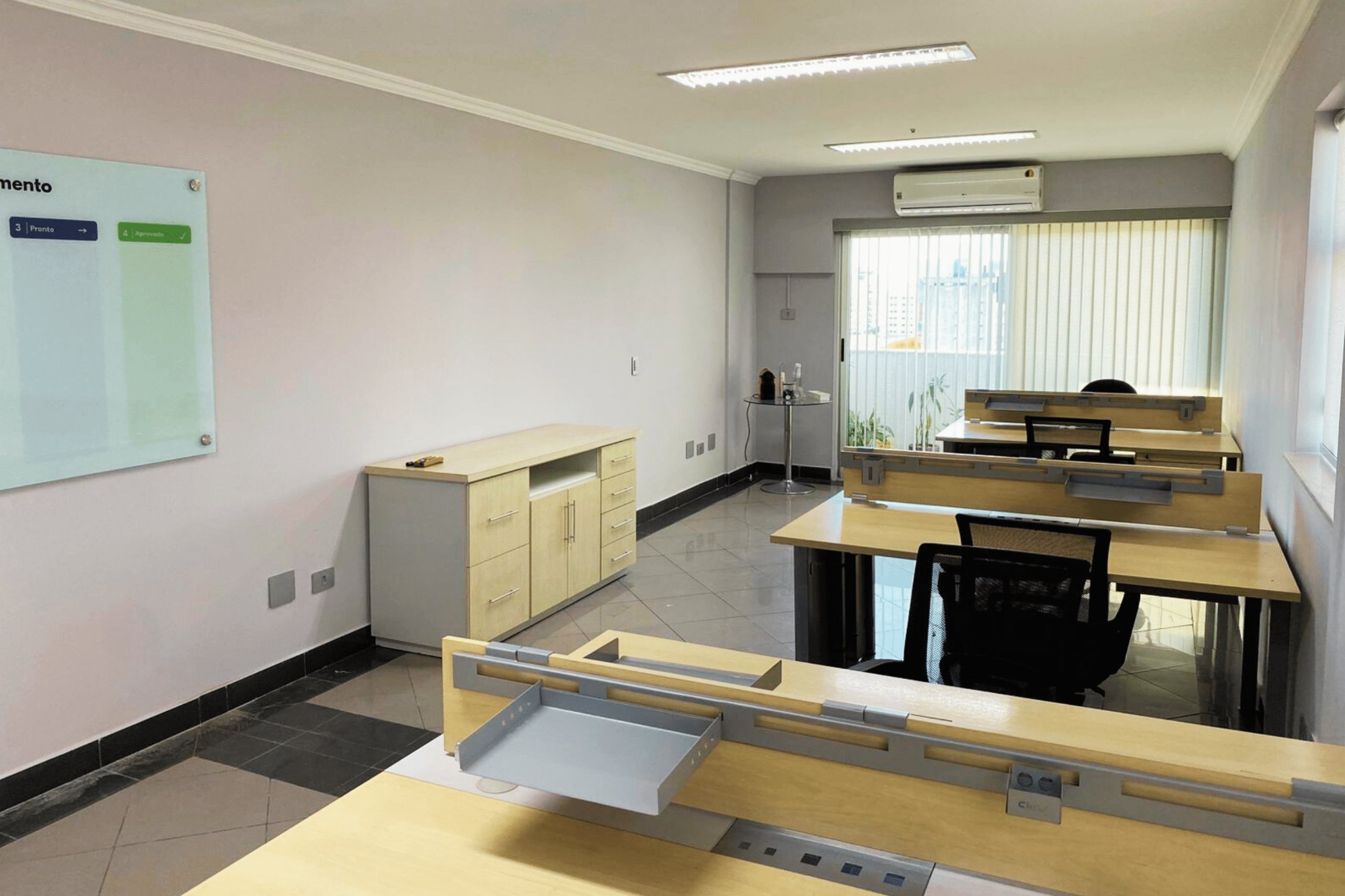Mesa de trabalho que pode ser contratada de forma fixa ou rotativa.