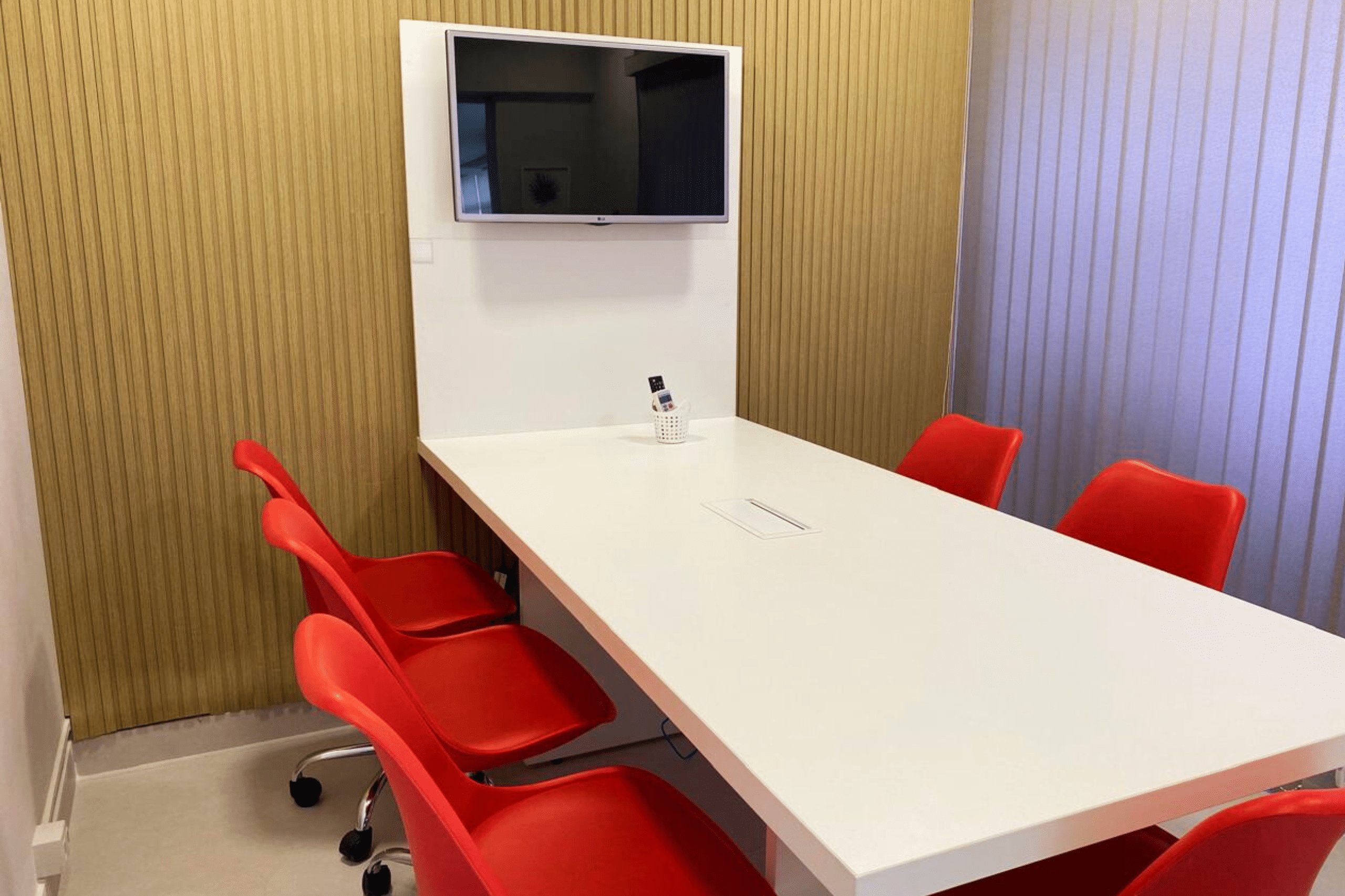 Sala para reuniões presenciais ou online, equipada com TV e comportando até 5 pessoas.
