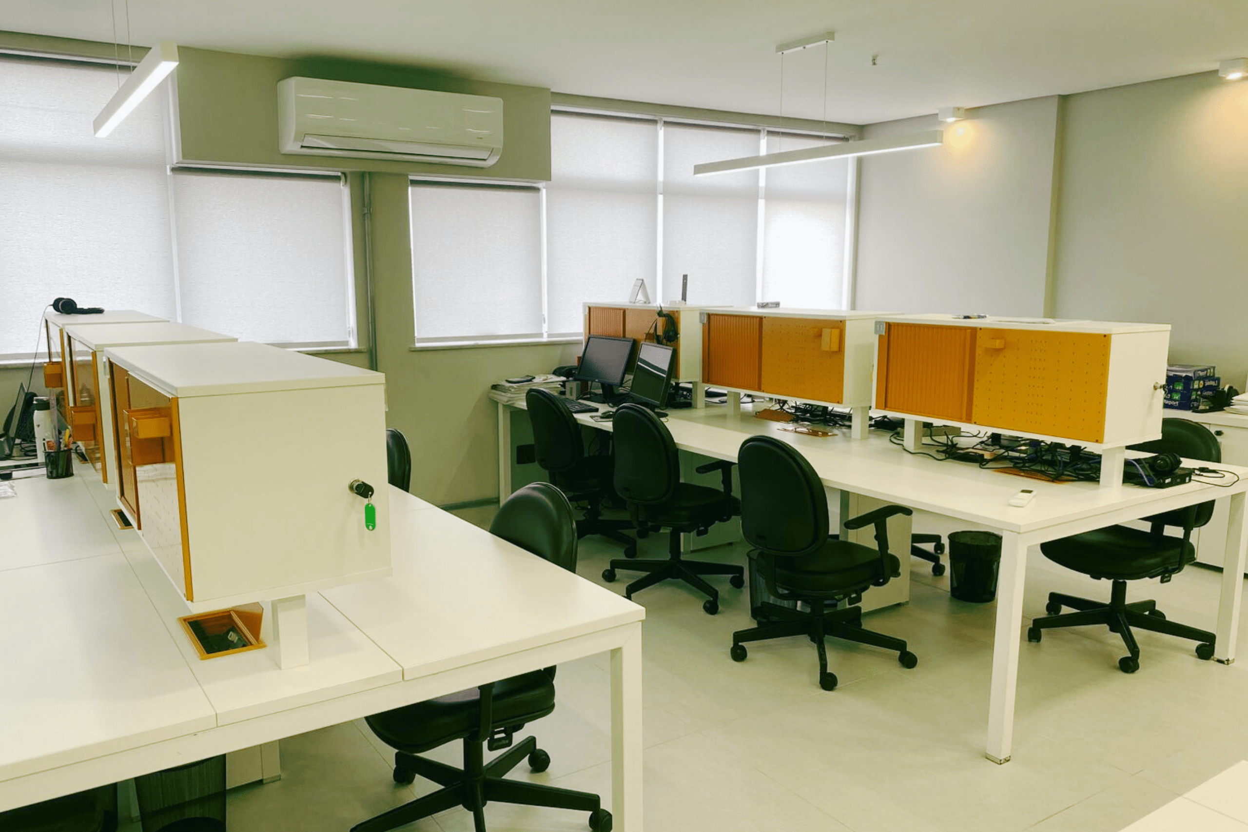 Mesa de trabalho que pode ser contratada de forma fixa ou rotativa.